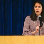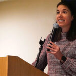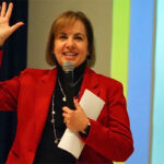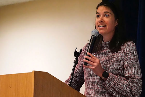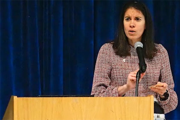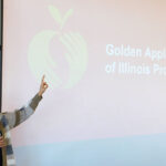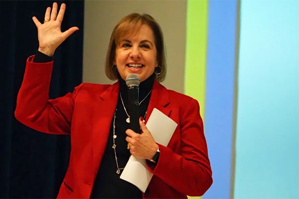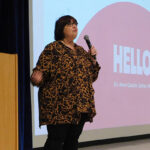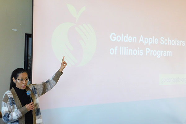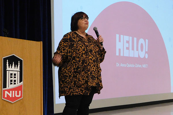 Dean Laurie Elish-Piper welcomed the students to the Carl Sandburg Auditorium, where she introduced keynote speaker Kimberly Radostits, the 2022 Illinois Teacher of the Year.